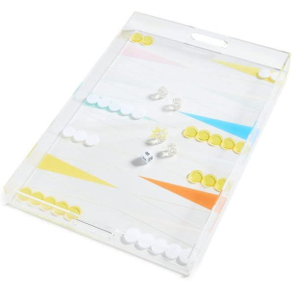A stylish SunnyLife backgammon set in transparent acrylic, accented with multicolor trim in the label's signature bright hues.