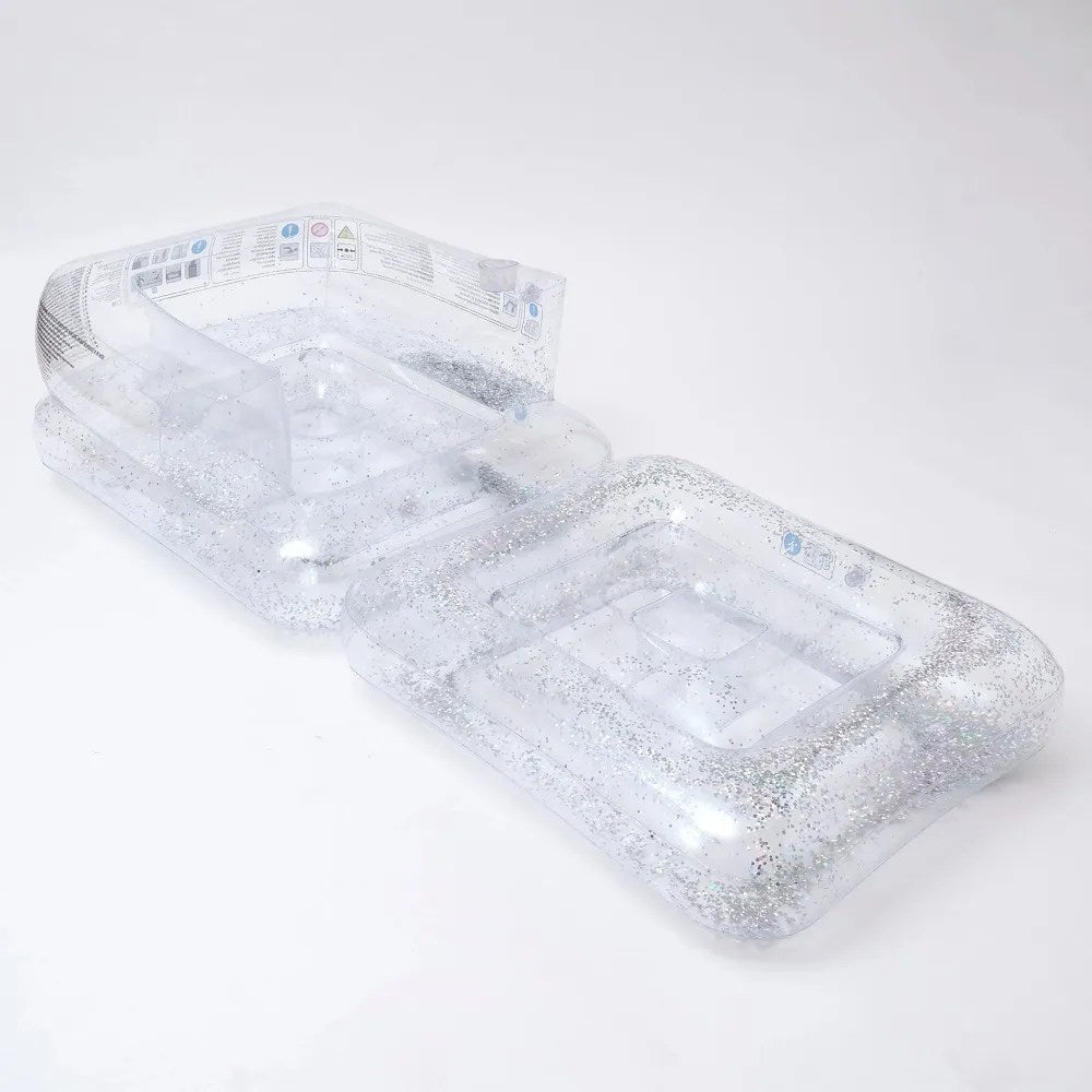 Lay back and chill this season with the Glitter Inflatable Lilo Chair. It is super chic, classy and fun, perfect for poolside and seaside floating. Featuring a handy cup holder and the option to sit or recline, this 2-in-1 inflatable is set to glisten and shine all year long. Bring some added sparkle to your life with its transparent and silver holographic confetti design that will elevate your summer style.