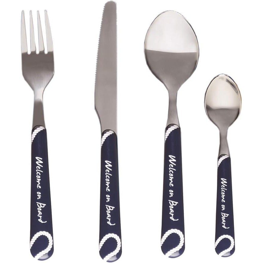 The Welcome On Board 24-piece stainless cutlery set (6 servings), is made of stainless steel and has the handle in ABS screen printed with nautical flags. Matching with melamine tableware, the cutlery from the Welcome On Board collection is a must for a beautiful coordinated table. Don't forget the special mocha spoons for coffee cups!