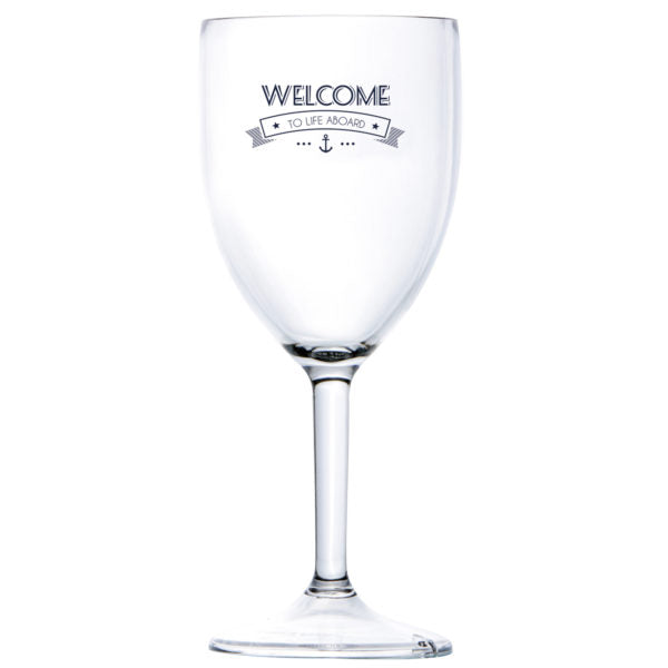 Set of unbreakable wine glasses with nautical design. This practical nautical accessory for yachts and boats is made of MS.Methylstyrene is a high quality material, shock resistant and unbreakable and which also helps us to avoid scratches
