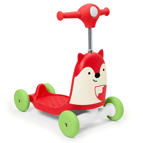 Designed to grow with your little one for three stages of fun, Skip Hop’s cute and colorful Ride-On Toy offers an entertaining way to encourage motor skills development, balance and coordination at playtime. Stage one, designed for early walkers, motivates little ones to push and pull in wagon mode—a great spot for favorite toys, too. At stage two, the wagon’s storage tub converts to a seat for ride-on mode. Ready for stage three? Just remove the seat, pull up the adjustable handle for your toddler, hop on the scooter and take it for a spin! They’ll love pressing the button at the front for a headlight, melodies, a beep sound and more fun sound effects as they whizz along.