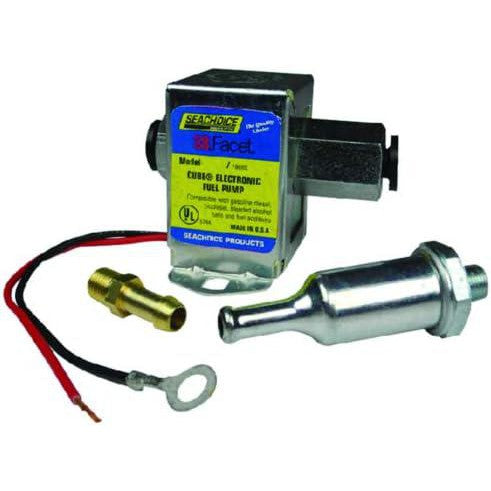 12V Cube Electronic Fuel Pump Kit Includes 74 Micron FilterCompatible with gasoline, diesel, biodiesel, blended alcohol fuels and fuel additives. For 12 volt systems only. Not intended for aircraft use. 60" Lift, 1/8 x 27 Thread w/Check Valve Easy to install Coast Guard ignition test approved UL (574A) Certified Built-in Anti-Siphon Valve 74 Micron filter included Self-regulating Transient Protection Internal check valve, self-priming Reliable solid state design provides longer life Made in U.S.A by FACET. PSI 4.5 - 3.0 GPH 30 OEM # 40288 Volts 12