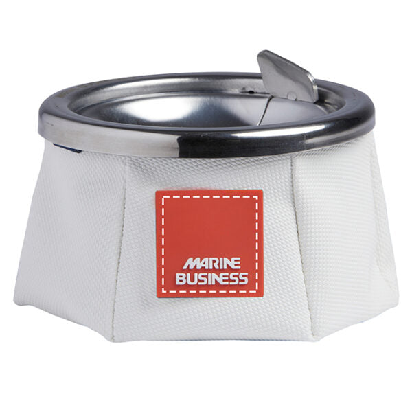 Windproof and shockproof ashtray, made of stainless steel and leatherette fabric.